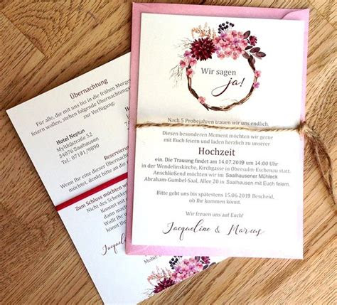 Der Text der Einladung sollte kurz und prägnant sein, aber dennoch alle wichtigen Informationen enthalten. Geben Sie das Datum, die Uhrzeit und den Ort der Hochzeit an, sowie die Namen des Brautpaares und ihrer Eltern. Sie können auch einen kurzen Hinweis auf das Hochzeitsfest geben.
